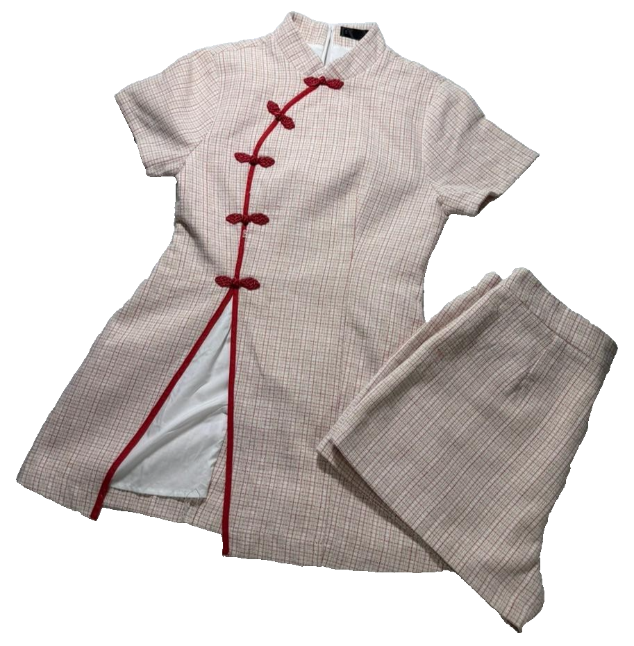 Vintage Asian Style Cheongsam Dress Voir Beige Red Trim Short Sleeve - Size S