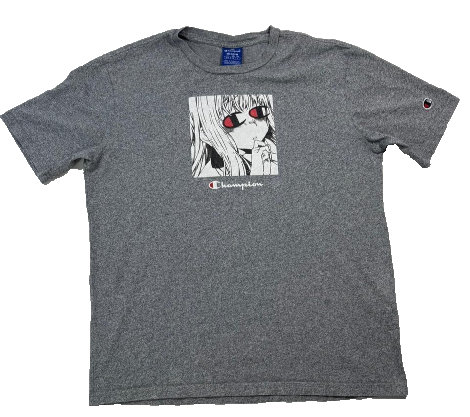 Gray Champion Crewneck T-Shirt With An Anime Graphic Print - Size M