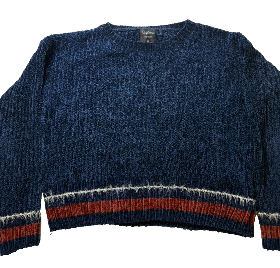 - Cozy chunky-knit pullover sweater in a stylish blue striped pattern. - Features long raglan...