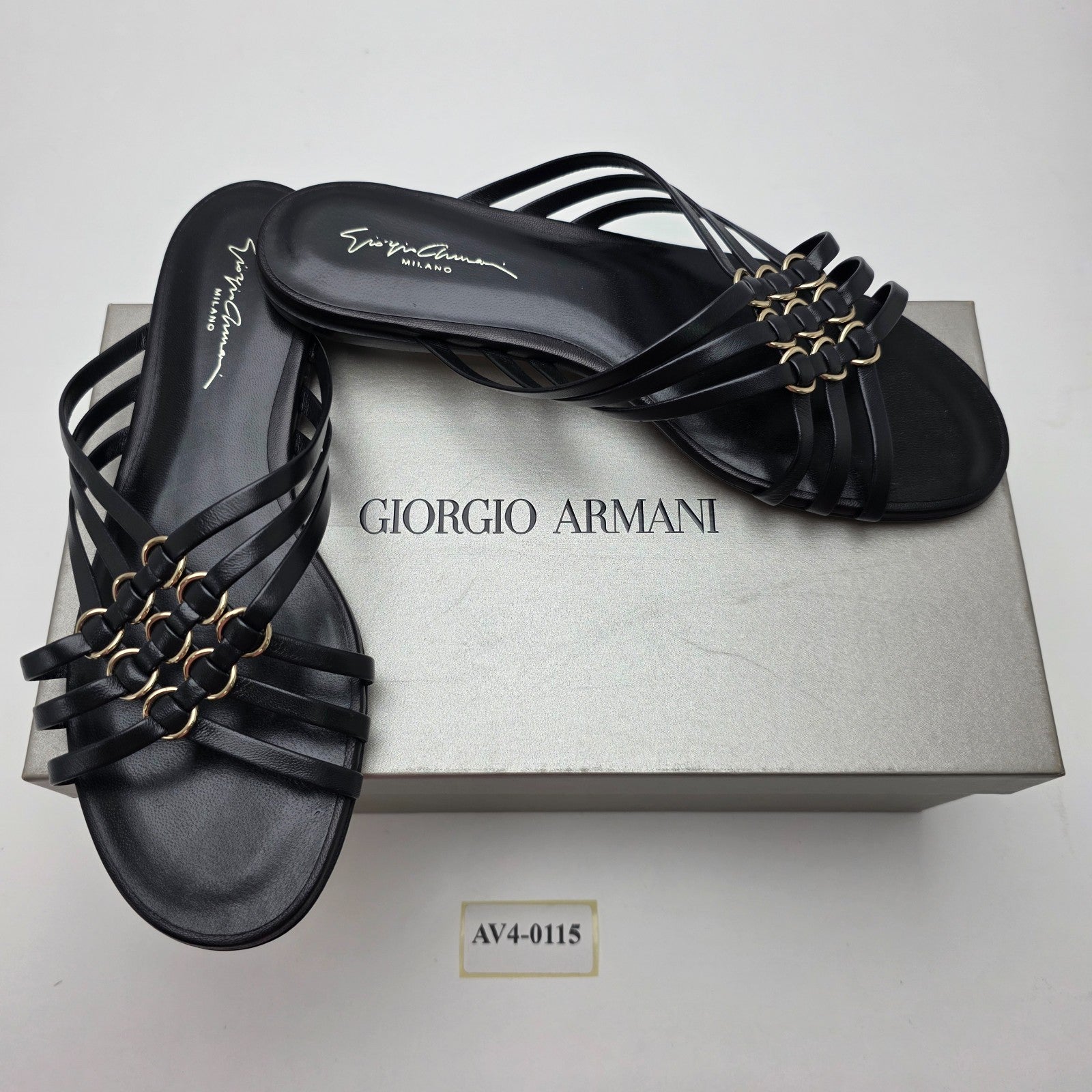Giorgio Armani Black Crossed Leather Sandals With Gold-Tone Rings - Size 39 Bnwt