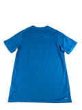 - Made from breathable blended fabric, featuring a solid blue color and a comfortable crew neck with short sleeves.