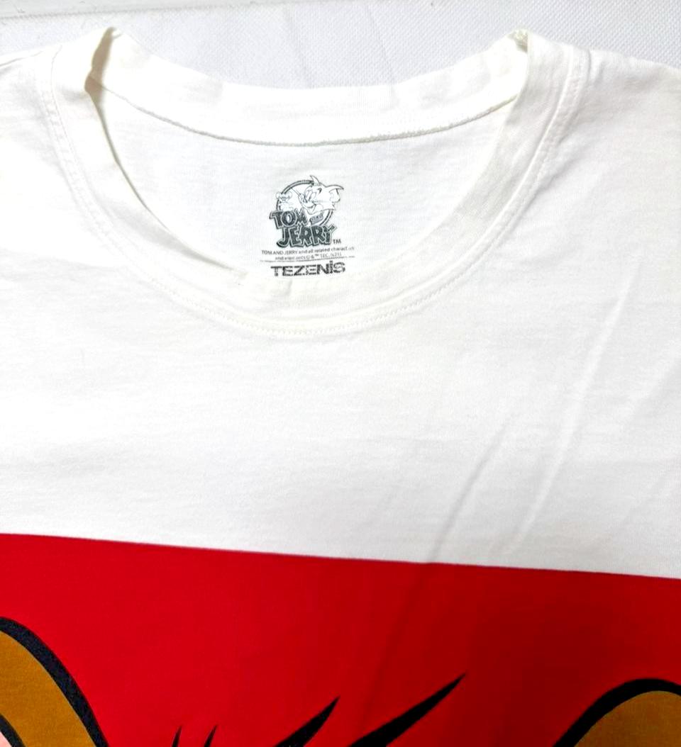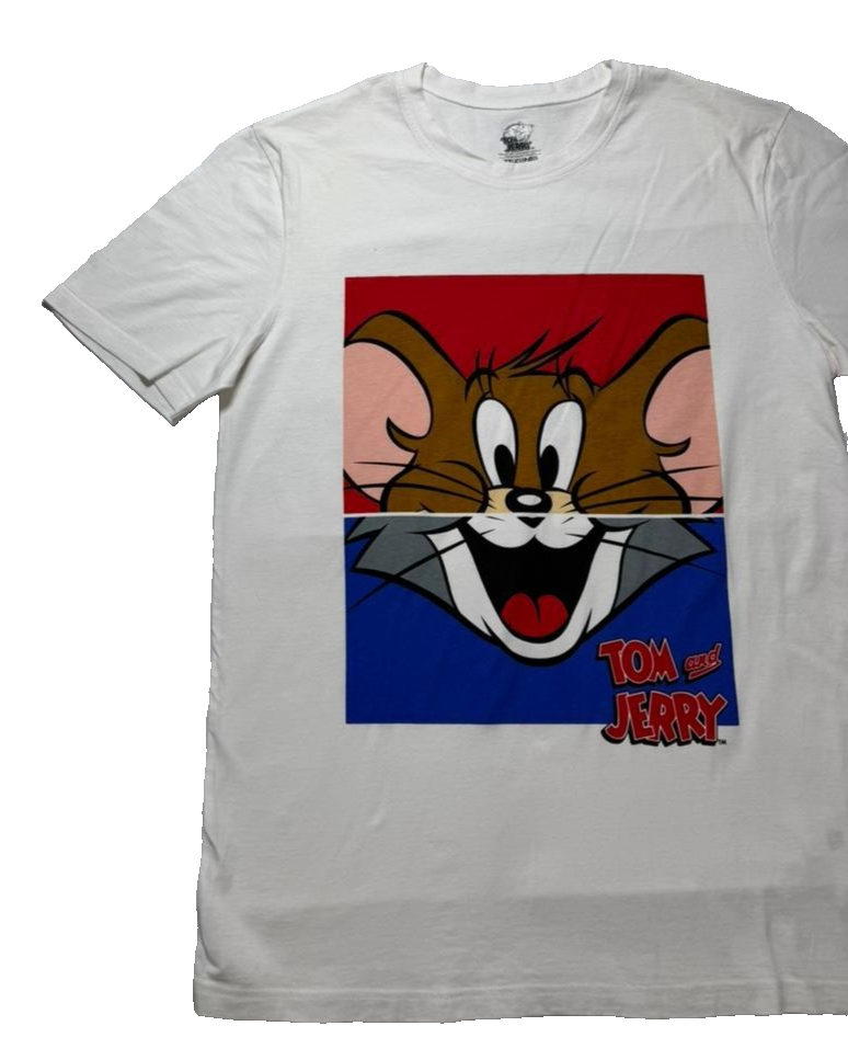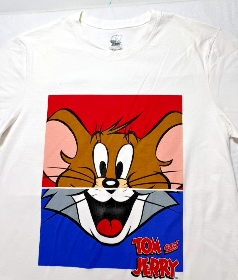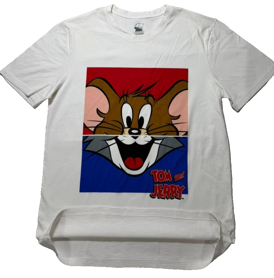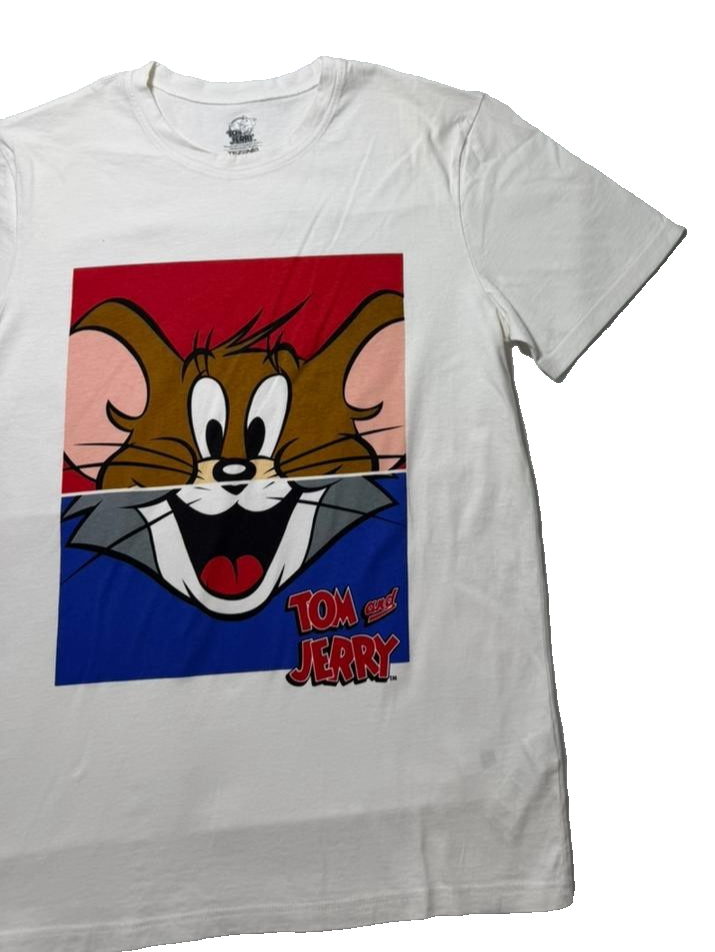 - Made from soft cotton, this white tee showcases a playful Tom & Jerry design.