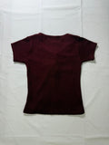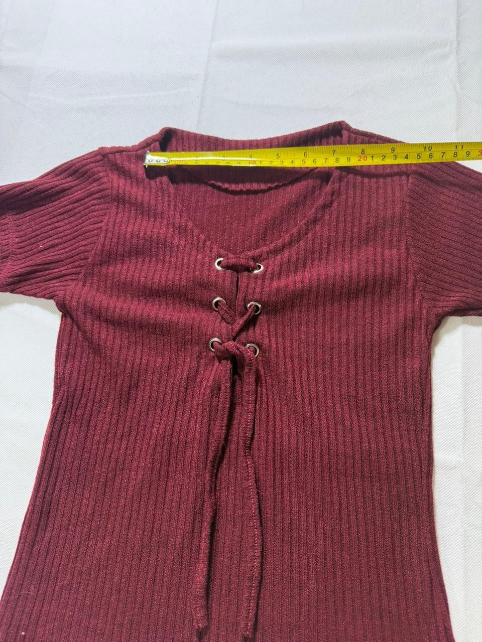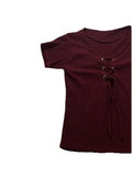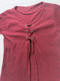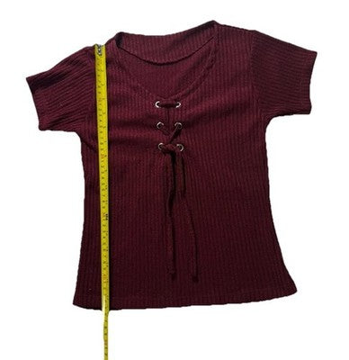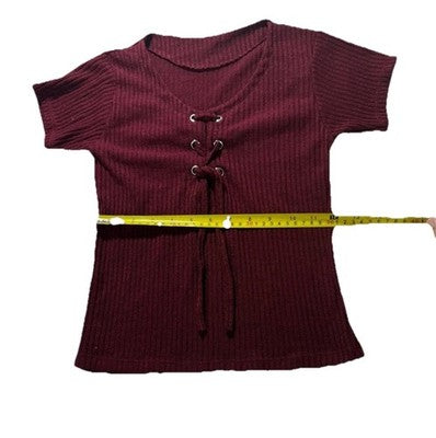 Women�S Burgundy Ribbed Short Sleeve Top Lace Up Front Knit Tee | S