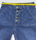 - Features a solid blue color, button closure, and practical pockets for a trendy yet functional look.